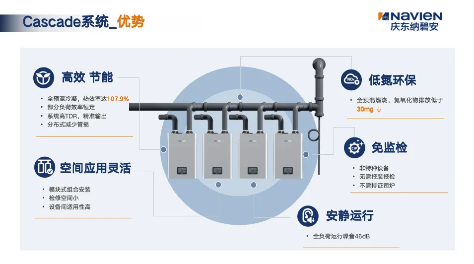 张文龙总监在演讲中介绍了庆东纳碧安的Cascade并联智控系统。该系统通过多台全预混冷凝炉的灵活组合,实现了智能调控和高效运行,不仅提升了整体热效率,更有效降低了运营能耗,充分体现了“高效节能”的优势。同时,全预混燃烧技术大幅减少氮氧化物排放,达到低碳环保要求,助力绿色发展。
