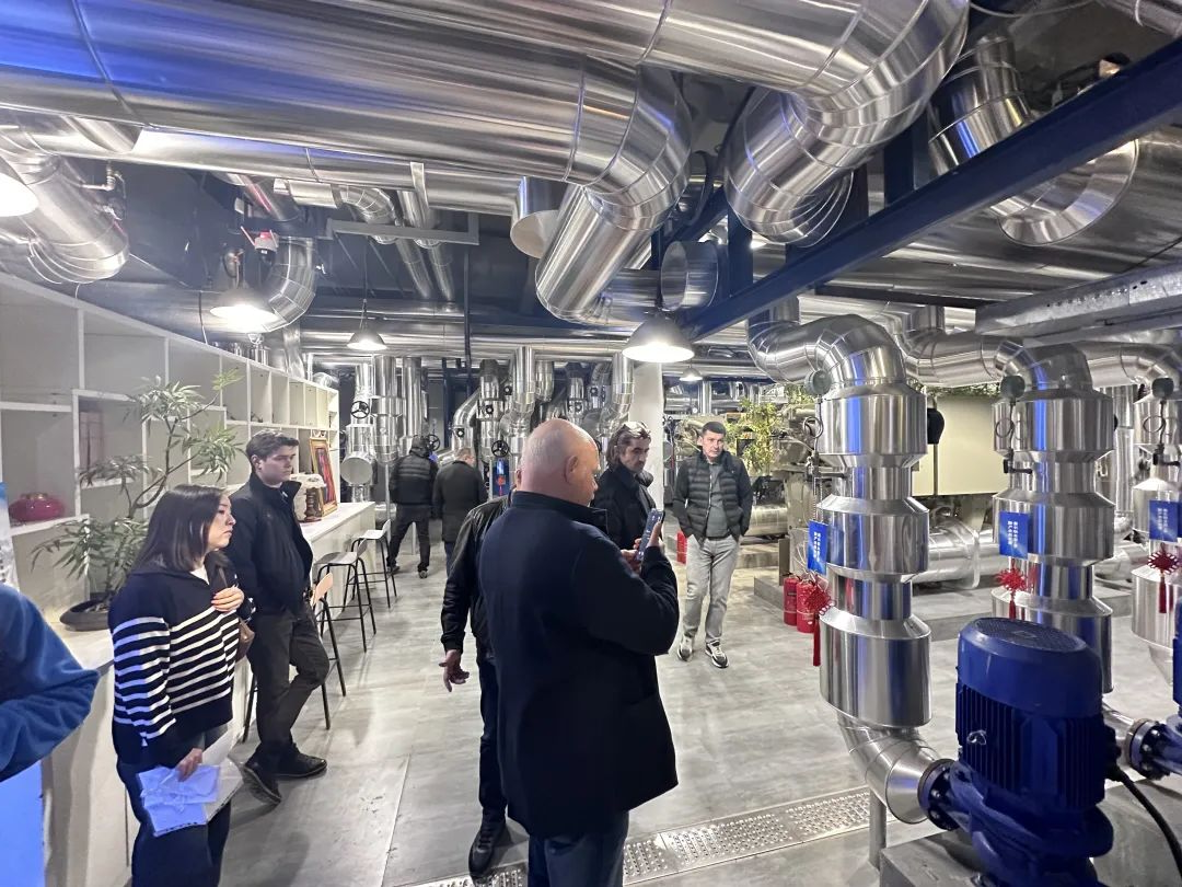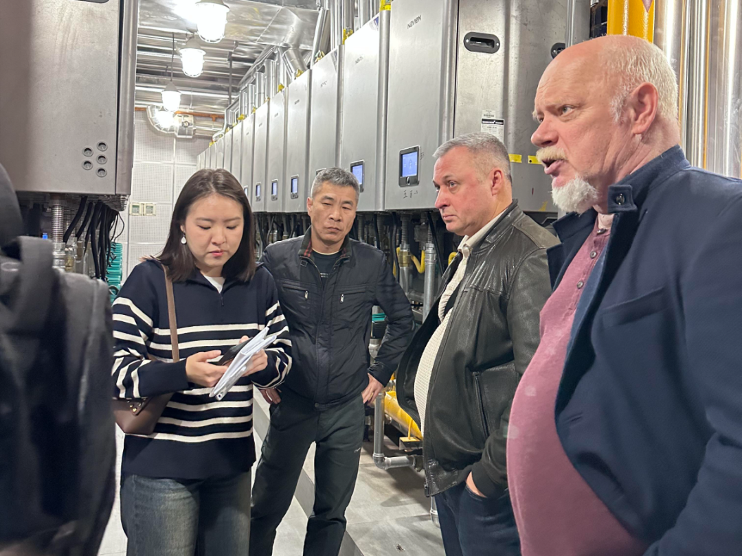 第二站,参观团队前往北京兴涛社区,这里100台NFB-98HC并联系统的高效运转让俄罗斯伙伴啧啧称奇。这套系统以其智能调节和节能环保性能成为城市供暖的“隐形英雄”。尤其是烟气余热回收技术,将排烟温度降至20℃以下,不仅显著减少了能源浪费,还有效解决了冬季“白烟滚滚”的困扰。这一技术凭借其高效节能和环境友好的特点,展现了广泛的应用潜力,赢得了国际合作伙伴的高度评价,被认为在寒冷地区具有重要的推广价值。更值得一提的是,通过远程智能APP控制,社区供暖实现了无人化管理,大大降低了运营成本,也为未来城市供暖方案提供了新方向。