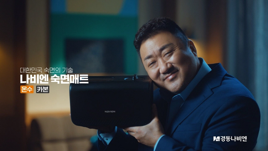 2023年,庆东纳碧安韩国总部正式签约马东锡为品牌代言人,并于当年秋冬推出两支广告片:一支围绕“冷凝ON AI杏彩足球”,一支则聚焦“舒眠床垫”。广告中,他没有冗长对白,只有几句平实话语:“热水,试试纳碧安的技术吧。” “要想睡得好,靠的不是偶然,是技术。”