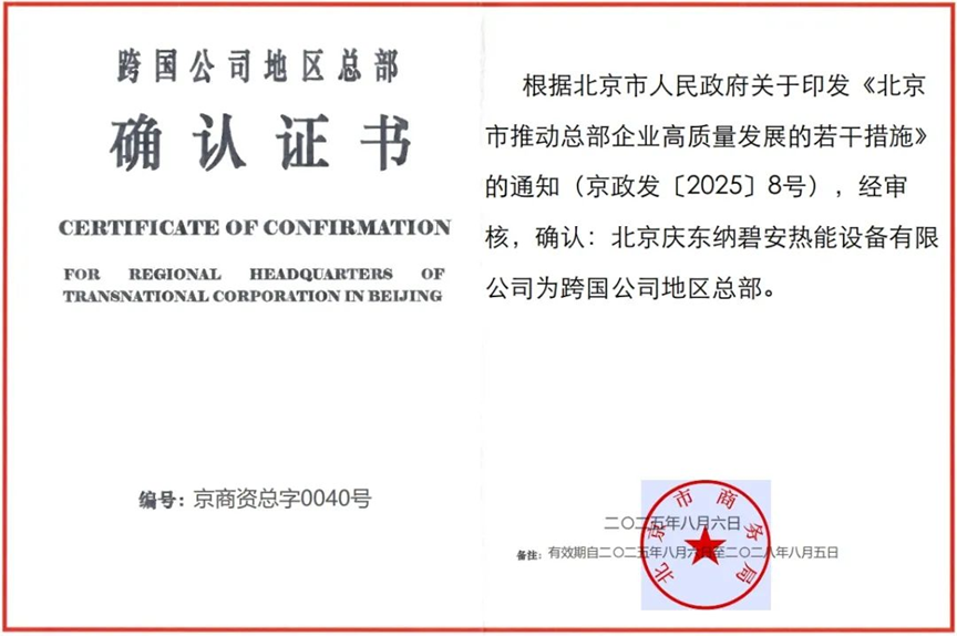 此次认证严格依据《北京市人民政府关于印发〈北京市推动总部企业高质量发展的若干措施〉的通知》(京政发〔2025〕8号)相关规定,由北京市商务局权威颁发。它不仅是对庆东纳碧安在京运营规模、经济贡献及战略地位的高度认可,更是公司全球化发展征程上的又一重要里程碑。
